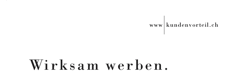 Wer mit seiner Werbung die wirksame Einheit zwischen der Macht der Bilder und der Wirkungskraft der Kommunikation unterschätzt, indem er auf die clever konzipierte Wertsteigerung seiner Zielsetzungen verzichtet, verschenkt sich wertvolle Marktanteile. Am «Return of Investment» betrachtet, im Grunde genommen unnötig seine besten Aussichten. Unsere Broschüre «Wirksam werben» zeigt auf warum und wie Sie davon profitieren. Ihr Mail oder Anruf genügt; gerne stellen wir sie Ihnen, ganz althergebracht, auf dem Postweg zu.
