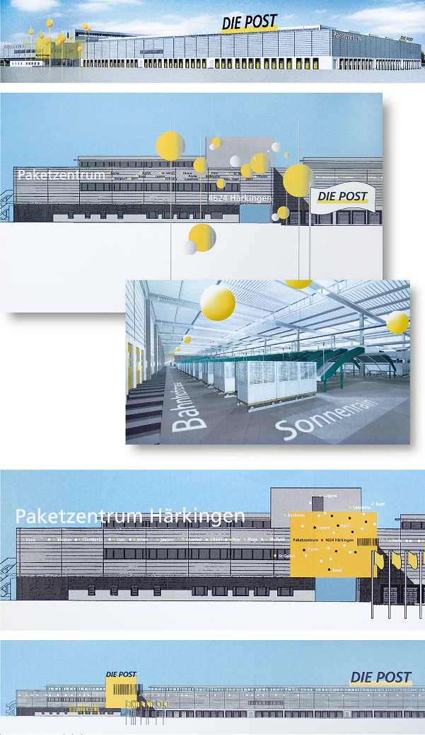 Konzept-Studie zur Aussenbeschriftung der 4 Verteilerzentren der Post mit Auftaktthemen für Eingangs- und Sortierbereich.