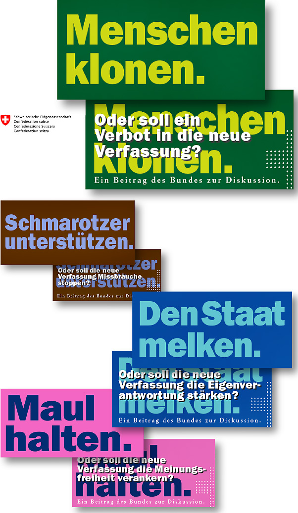 Grosse Teasing-Plakat-Kampagne im Vorfeld der Abstimmung. Bundesrat Villiger genehmigt. Ausser zwei Sujets. Welche?